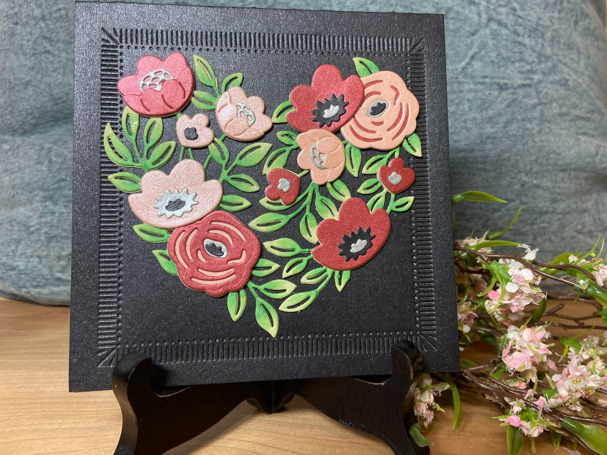 I ran the front of the card base through my die cut machine using Spellbinder’s Fluted Classics Squares, which embossed the front of the black cardstock. I then adhered the green leaves and flowers to the front of the card in the shape of a heart.