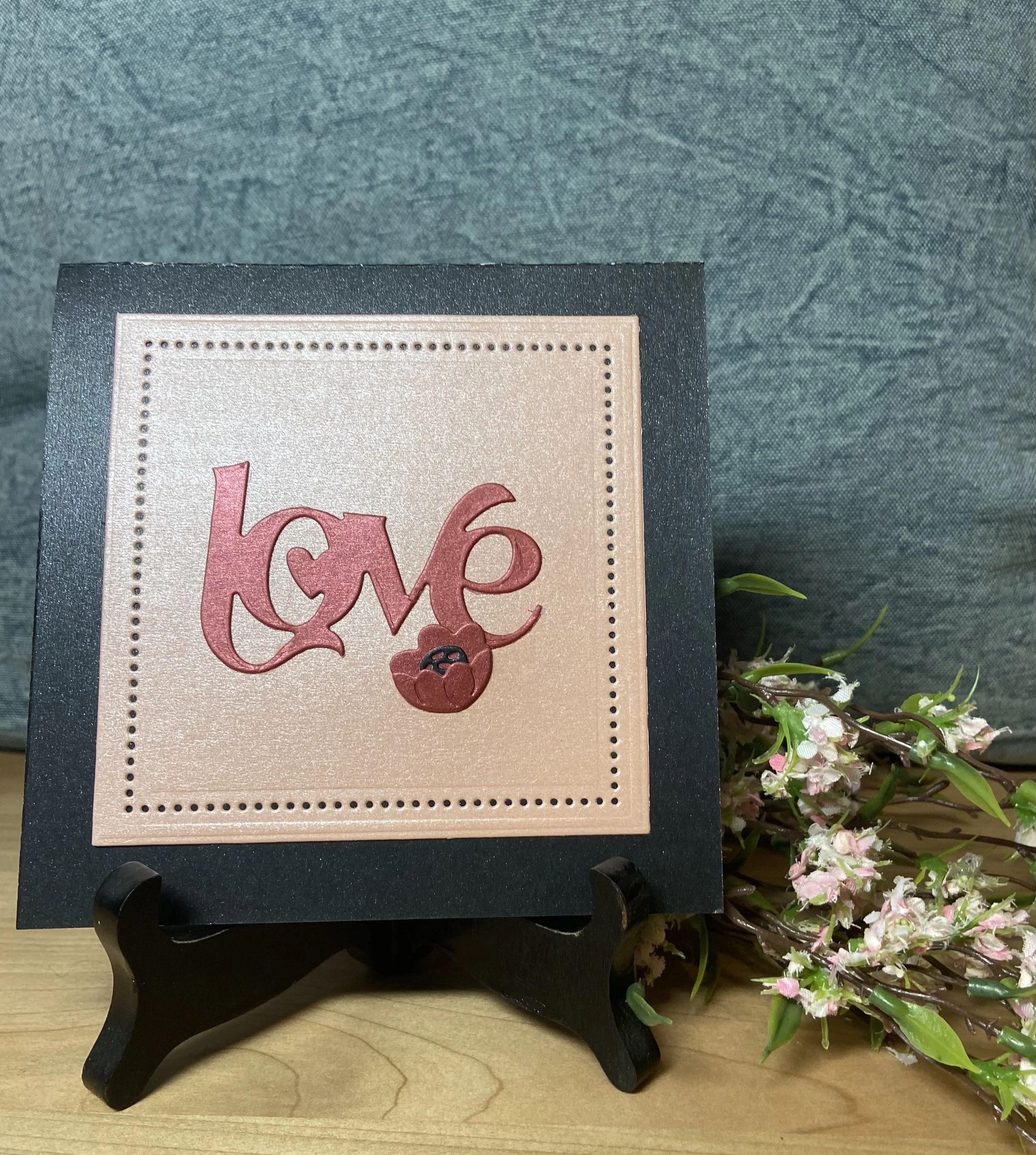 I cut the “Love” sentiment using the Fancy Love die from Simon Says Stamp and Tonic Red Velvet Pearlescent cardstock.